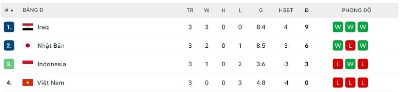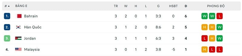 Trong khi đó, ĐT Bahrain với tổng cộng 6 điểm lại là đội đứng nhất.