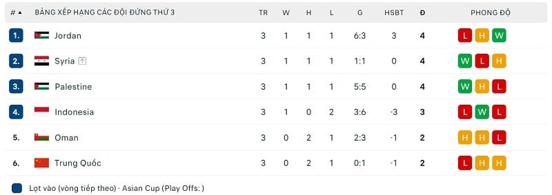 Các đội đứng thứ 3 đi tiếp: Jordan, Syria, Palestine, Indonesia