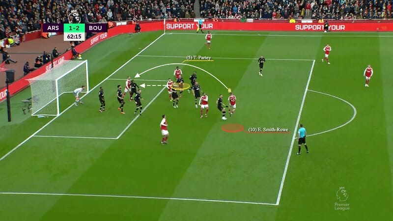 Pha đánh đầu của số 10 tạo điều kiện giúp Thomas Partey đệm bóng rút ngắn tỷ số.