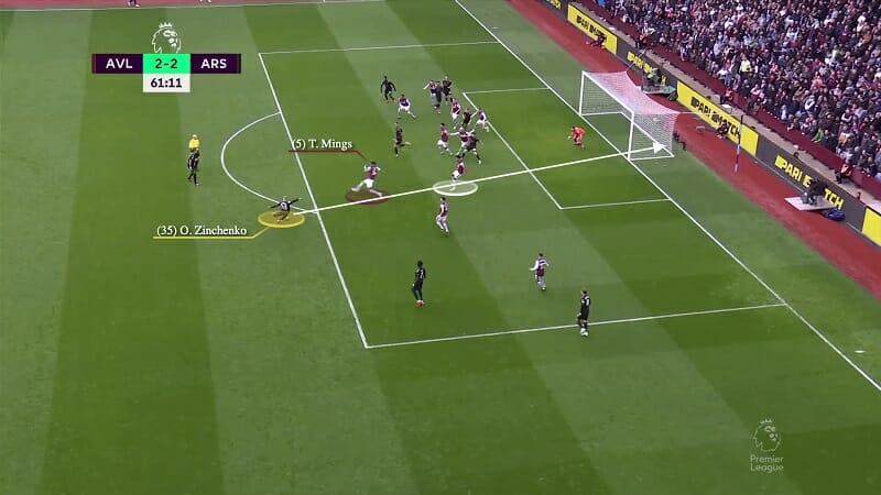 Với tình trạng quân số như vậy, không ai dám theo kèm Zinchenko – người đã di chuyển lại gần hòng nhận đường chuyền. Rốt cuộc, hậu vệ người Ukraine có bóng. Không phải hàng phòng ngự Aston Villa không nhìn thấy số 35, mà họ không biết phải cắt cử ai theo kèm một cầu thủ đứng tại vị trí đó. Rốt cuộc, Zinchenko tung ra pha dứt điểm đánh bại Emiliano Martinez.