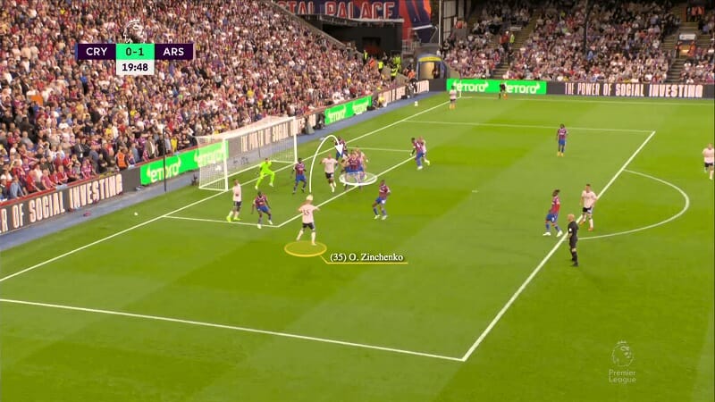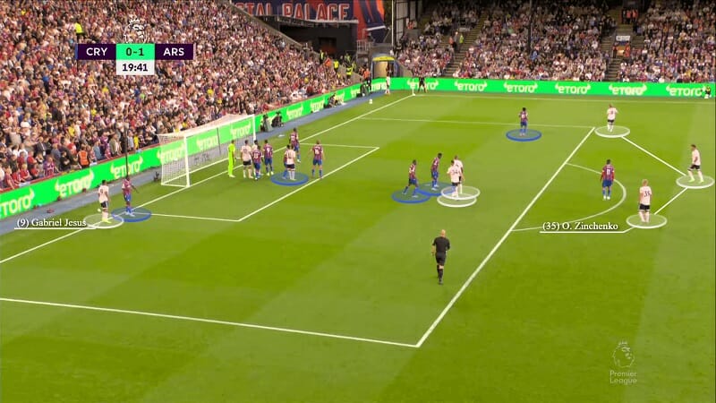Trong một tình huống khác tại màn thư hùng với Crystal Palace, tân binh 26 tuổi tiếp tục đứng ngoài vùng cấm địa. Các hậu vệ đội chủ nhà bỏ qua Zinchenko bởi họ nghĩ anh chỉ làm công việc chống phản công.