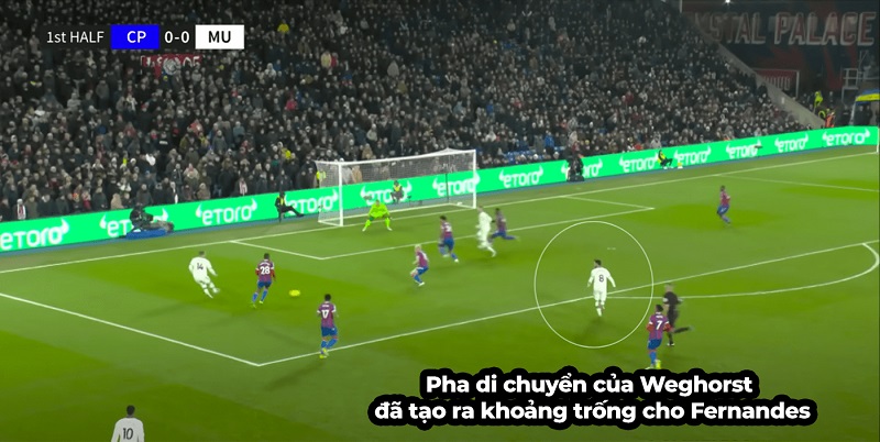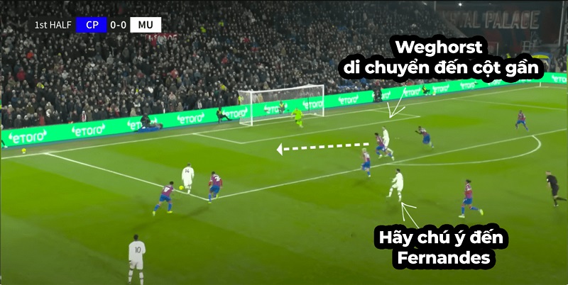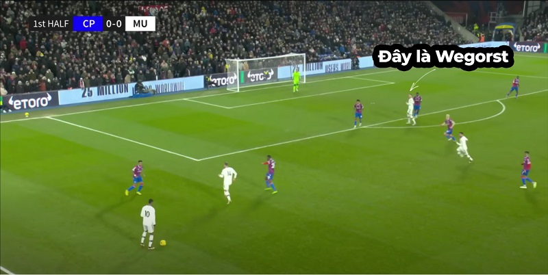 Một ví dụ tiêu biểu xuất hiện ngay trong trận ra mắt của số 27 trước Crystal Palace. Pha tấn công bắt đầu khi Marcus Rashford có bóng bên hành lang trái, còn Weghorst chiếm vị trí nơi trung tâm và được kèm cặp bởi hai hậu vệ đội bạn.