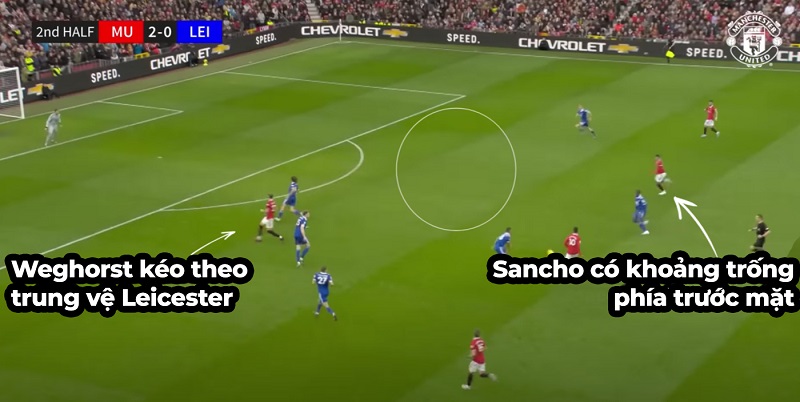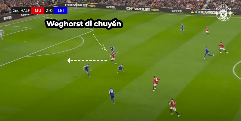 Phương án di chuyển như thế này rõ ràng đã được HLV Erik ten Hag chỉ bảo cụ thể, và nó tái hiện ở bàn thắng thứ ba vào lưới Leicester City hồi cuối tuần trước. Vẫn là Rashford rê bóng và Weghorst tăng tốc ra phía ngoài, khiến cầu thủ đối phương buộc phải chạy theo.