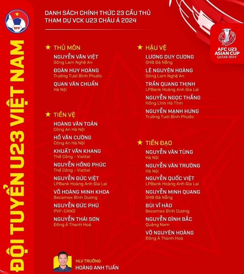 HLV Hoàng Anh Tuấn đã chính thức đưa ra quyết định cuối cùng về danh sách 23 cầu thủ của U23 Việt Nam tham dự VCK U23 châu Á 2024.