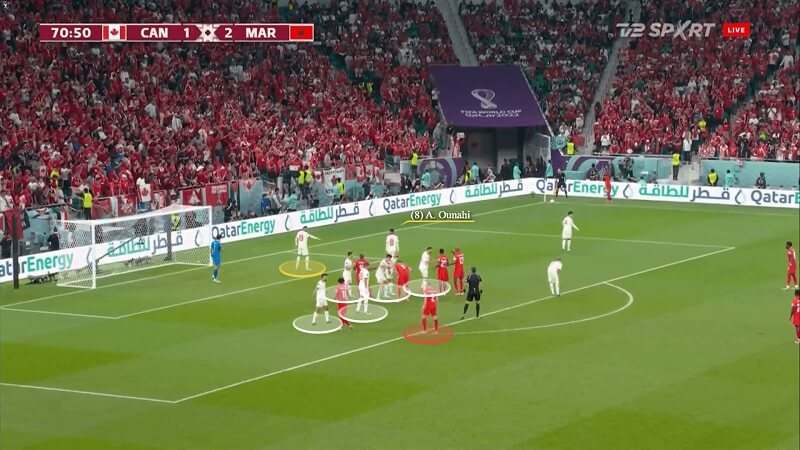 Trong tình huống này, Ma Rốc bố trí 6 cầu thủ theo kèm đối phương xung quanh chấm penalty (vòng tròn trắng) và 2 người khác tại cột gần (vòng tròn vàng).