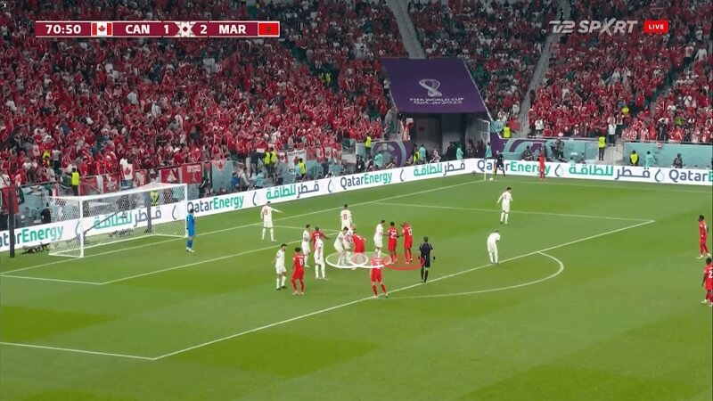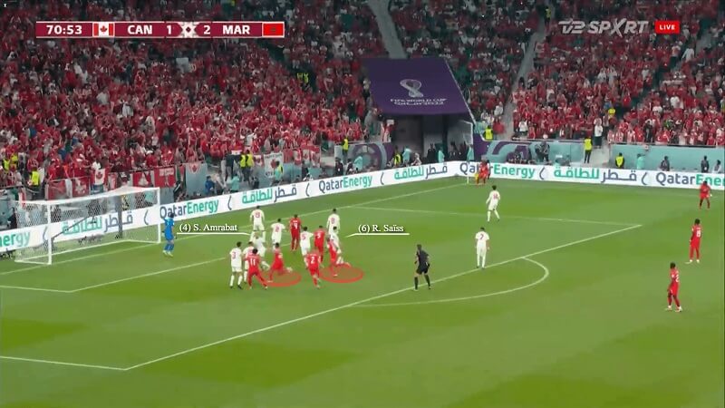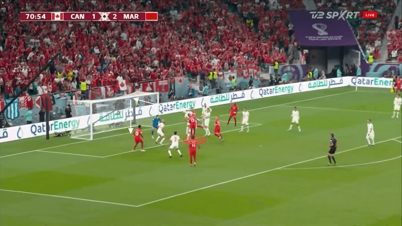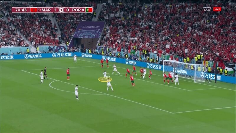 Ngay cả trong trận tứ kết với Bồ Đào Nha, Ma Rốc cũng suýt phải nhận một cú dứt điểm nguy hiểm nếu như đối phương không chuyền hỏng. Tại tình huống đá phạt dưới đây, đoàn quân áo đỏ cố gắng bảo vệ khu vực cột gần bằng 2 cầu thủ. Ngoài ra, họ cắt cử 4 người theo sát 4 cái bóng áo trắng. Nhưng vì vậy mà Morocco để cho Bernardo Silva (vòng tròn trắng) đứng hoàn toàn trống trải.