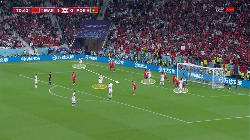 Quỹ đạo di chuyển của Cristiano Ronaldo và Pepe đã kéo hàng thủ Morocco vào trong khu vực 5m50 và ghim luôn hai cầu thủ đứng tại cột gần là Hakimi và Walid Cheddira. Không gian dành cho Bernardo đã rộng mở, nhưng Bruno Fernandes lại chuyền quá mạnh và còn nhắm vào chân không thuận của người đồng đội, khiến số 10 chới với.