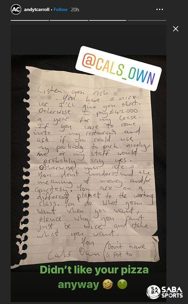 Dính phải chuyện này, Carroll chẳng những không hối lỗi mà còn thách thức chủ nhà hàng. Chân sút của Newcastle còn lên mạng xã hội Instagram chụp lại mẩu giấy này với nội dung mỉa mai: “Dù thế nào thì pizza nhà ông cũng chẳng ra gì”.