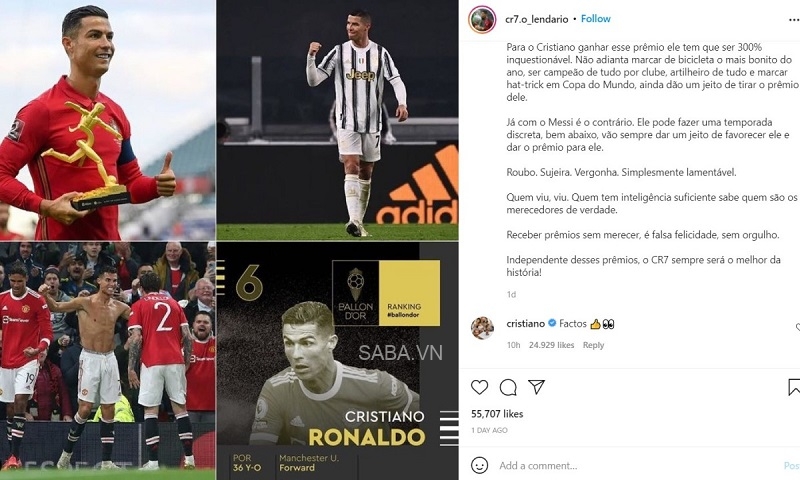 Tháng 12/2021, Ronaldo đã để lại thông điệp: “Factos – Sự thật” dưới một bài đăng của fan hâm mộ để nêu lên sự bất công của Ronaldo so với Messi trong việc đua tranh các danh hiệu cá nhân, nhất là QBV. Mới đây, Ronaldo còn gây sốc khi gọi Rooney và Carragher là: “Hai kẻ ghen tỵ” ngay dưới bài đăng của Wayne Rooney.