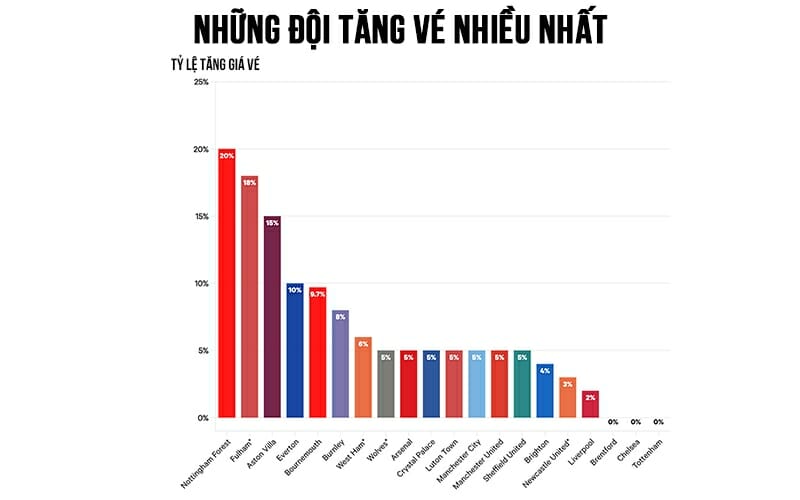 Có tới 16 trên tổng số 20 đội Ngoại hạng Anh đã tăng giá vé mùa tới, một số thậm chí còn có mức tăng mạnh. Theo đó, Nottingham là đội tăng khủng nhất với 20%. Nguyên nhân chính là bỏ đi vé dành cho lứa tuổi 18-23, những ai trên 20 đều được xem là người lớn.