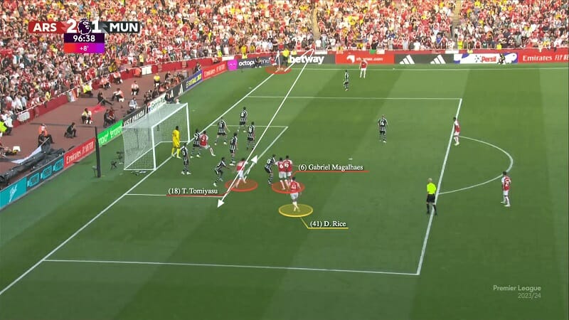 Khi chống phạt góc, Quỷ Đỏ bố trí 4 cầu thủ ở khu vực cột gần. Tuy vậy, họ bị “hớ” vì Pháo Thủ chọn tấn công về phía cột xa. Bộ 3 William Saliba, Kai Havertz và Gabriel Magalhaes bị 3 người bên phía MU theo kèm, nhưng chính họ đã chủ động lôi kéo đối phương ra chỗ khác để tạo khoảng trống cho Rice.