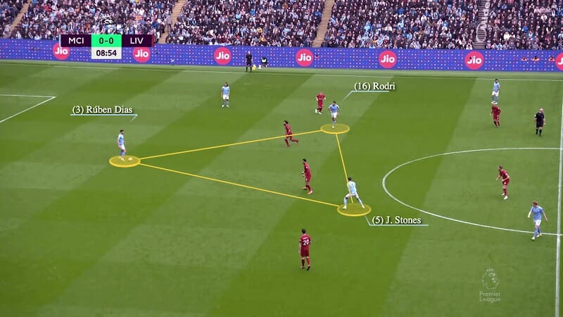 Khi đụng độ Liverpool, Stones trở thành điểm nhấn đáng chú ý trong cấu trúc triển khai bóng của Manchester City. Tuyển thủ người Anh đứng cùng tuyến với Rodri và xen giữa lớp phòng ngự đầu tiên bên phía The Kop.