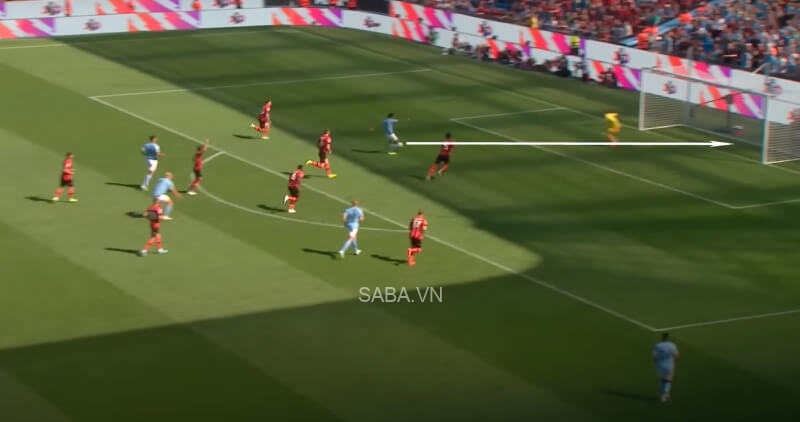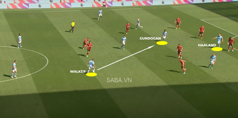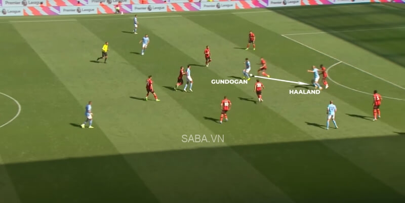 Vừa có bóng từ đường chuyền lên của Kyle Walker, Gundogan bật một chạm cho Haaland rồi ngay lập tức xoay người để tiến vào vòng cấm địa.