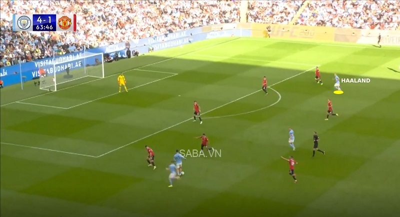 Ở bên trong, Haaland nhứ người về phía sau để đánh lừa đối phương. Đến lúc đồng đội đưa bóng vào, cựu sao Borussia Dortmund vòng ngược về phía trước.