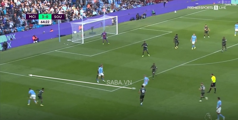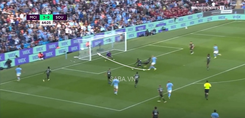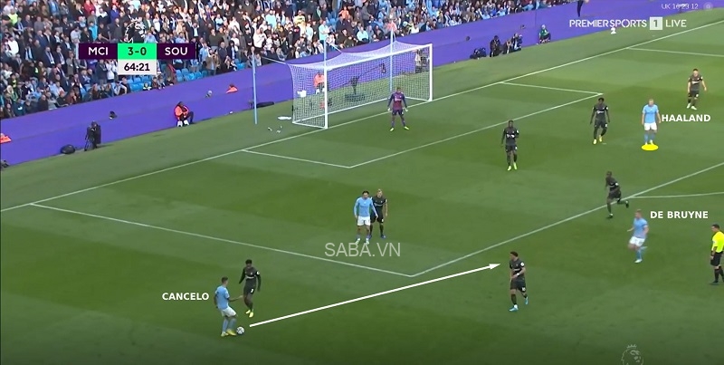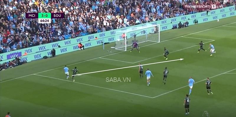 Cuối cùng, hãy xem xét bàn ấn định tỷ số của Haaland vào lưới Southampton ở vòng 10 Ngoại hạng Anh. Như thường lệ, De Bruyne xuất hiện ở hành lang trong để phối hợp. Lần này, anh bật tường với Cancelo.