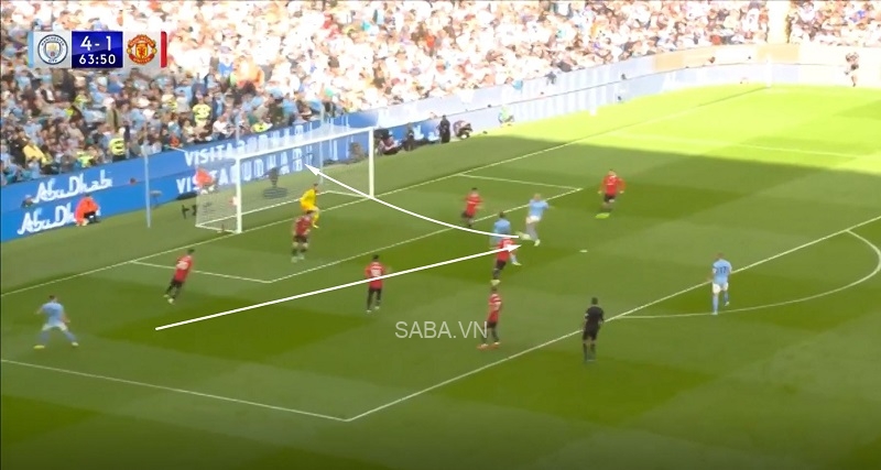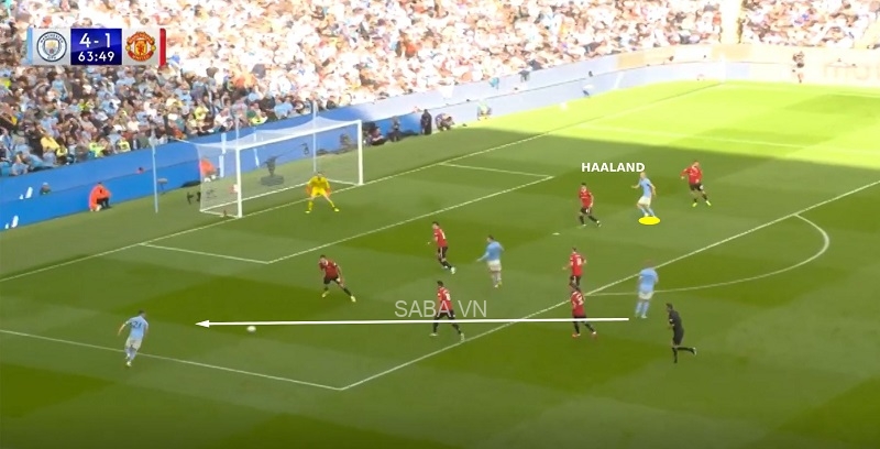Nhạc trưởng người Bỉ sau đó thả bóng xuống đúng đường chạy của Sergio Gomez, trong lúc Haaland lởn vởn đằng sau Lisandro Martinez.