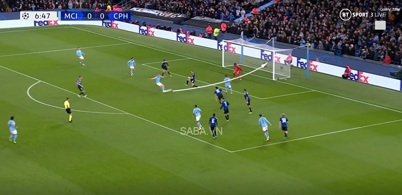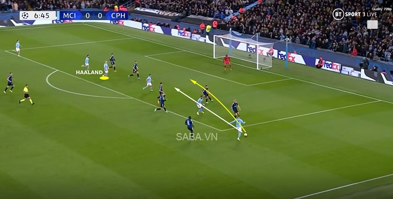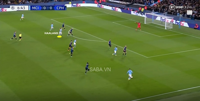 Một tình huống tương tự cũng diễn ra ở bàn mở tỷ số của The Citizens trước Copenhagen tại Cúp C1. Đầu tiên, Haaland tỏ vẻ như muốn lẻn ra sau lưng cầu thủ đang theo kèm mình. Nhưng rốt cuộc, anh lại di chuyển từ tốn để tạo khoảng cách với đối phương.