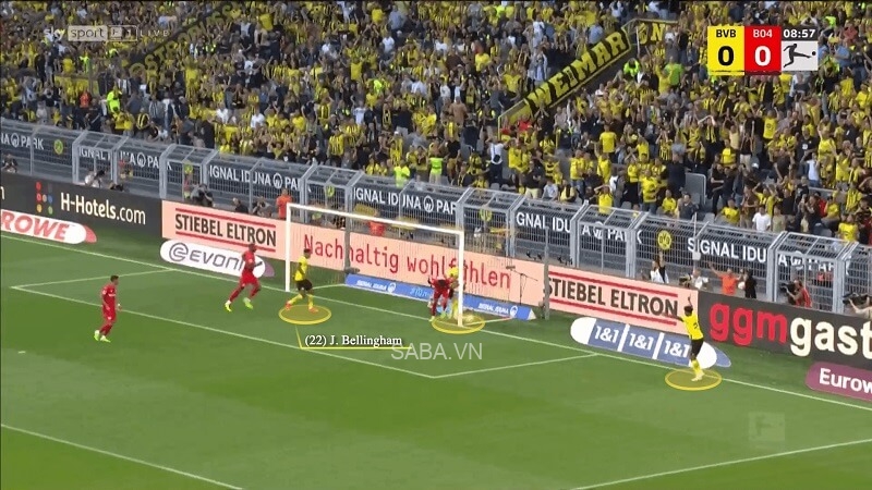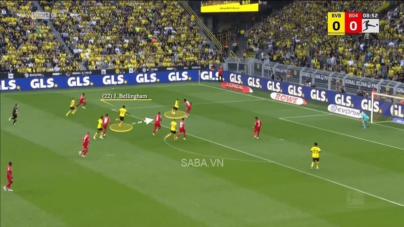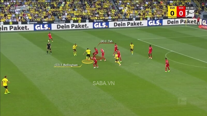 Ví dụ dưới đây đến ở màn thư hùng với Bayer Leverkusen. Bellingham áp sát trung vệ Jonathan Tah sau khi đối phương có bóng trong một khu vực đông đúc.