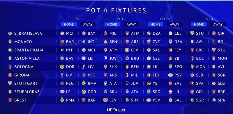 - Juventus: Man City (SN), RB Leipzig (SK), Benfica (SN), Club Brugge (SK), PSV (SN), Lille (SK), Stuttgart (SN), Aston Villa (SK).