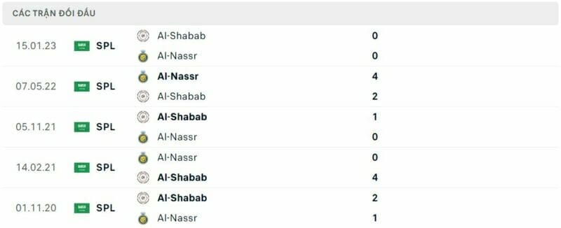Thành tích đối đầu Al Nassr vs Al Shabab