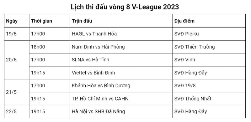 Hai trận còn lại của vòng 8 V-League 2023 là Khánh Hòa (hạng 7) gặp Bình Dương (hạng 14) lúc 17h ngày 21/5, và TP.HCM (hạng 12) gặp Công An Hà Nội (hạng 5) lúc 19h15 cùng ngày.