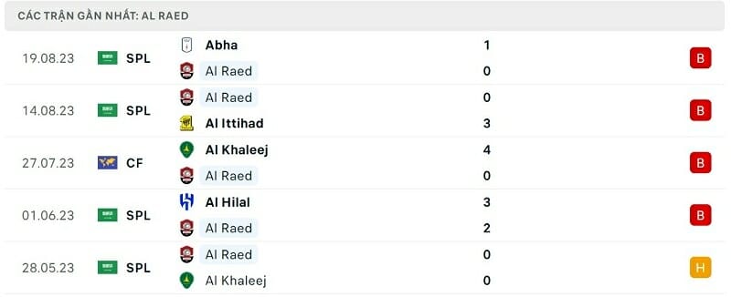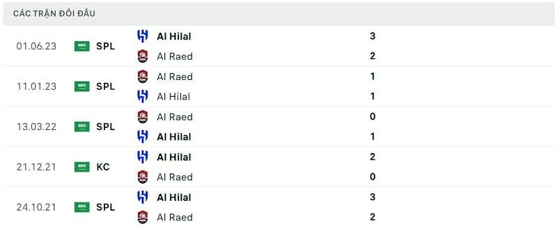 Thành tích đối đầu Al Raed vs Al Hilal: