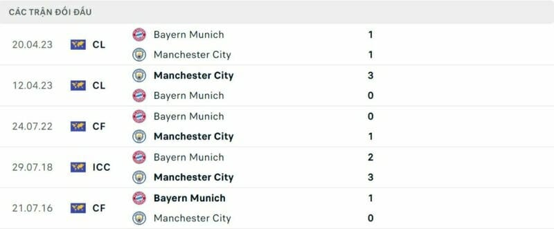 Thành tích đối đầu Bayern vs Man City: