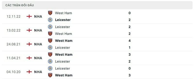 Thành tích đối đầu Leicester vs West Ham: