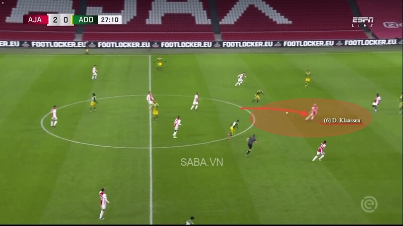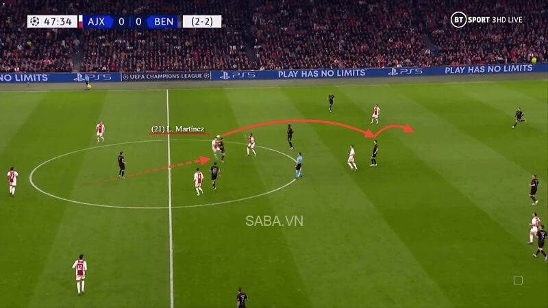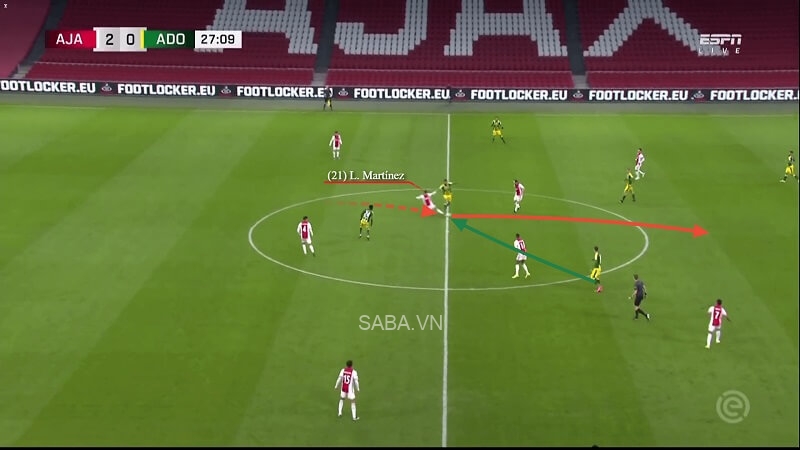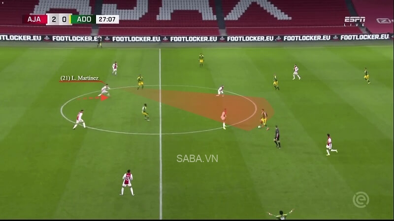 Lấy ví dụ như trong trận đấu với ADO Den Haag hồi tháng 3/2021, Martinez có một pha đọc tình huống tốt và bước lên phía trước để thực hiện cú xoạc bóng. Sau khi cắt được đường chuyền, chính số 21 đã đưa bóng lên cho Davy Klaassen. Thế là trong tích tắc, Ajax từ tư thế phòng thủ đã lại dẫn bóng vào khu vực final third (1/3 cuối sân).
