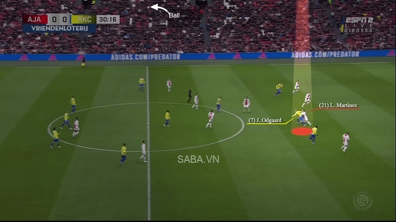 Ở hình phía dưới, chúng ta có thể thấy Martinez chủ động “đánh vật” với Odgaard. Một khi đã kiềm chế sức xoay sở của đối thủ, số 21 kiểm soát tình hình và phá bóng thành công từ phía sau.