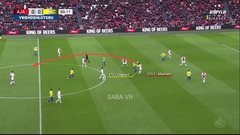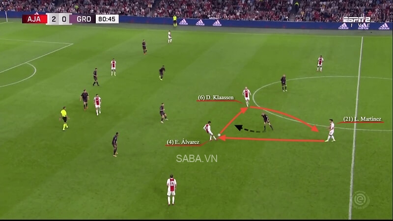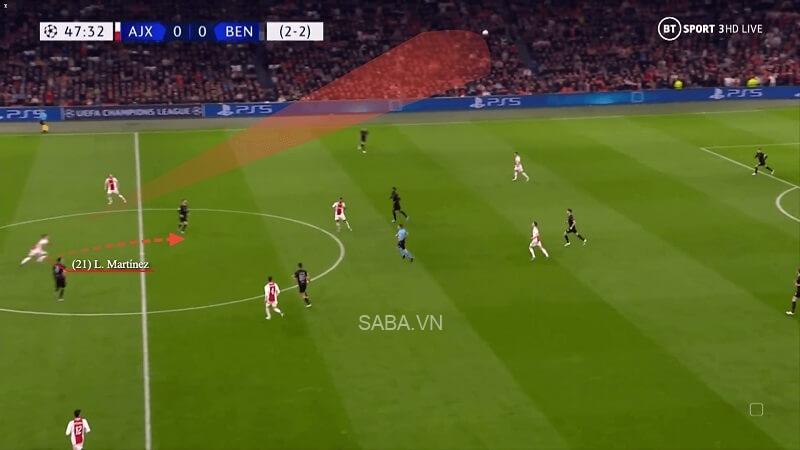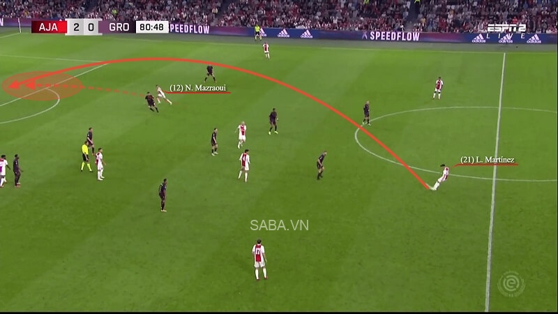 Trong màn tiếp đón Groningen mùa vừa rồi, Martinez, Edson Alvarez và Davy Klaassen phối hợp tam giác để tạo thêm khoảng trống ở gần vạch giữa sân. Với góc nhìn hướng lên phía trước và quả bóng trong chân, cầu thủ 24 tuổi tung đường chuyền vượt tuyến lên cho Noussair Mazraoui. Hậu vệ phải bên phía Ajax dứt điểm thành công ngay chạm đầu tiên chứ không cần khống chế, nhờ vào tầm nhìn và kỹ thuật chuyền bóng của Martinez.