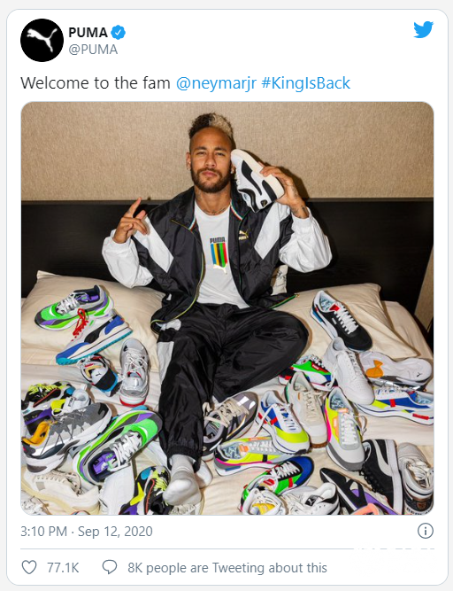 Puma đã đăng tải hình ảnh chân sút người Brazil trên trang web chính thức kèm theo thông điệp “Nhà vua đã trở lại”, và “Chào mừng đến với gia đình, Neymar”.