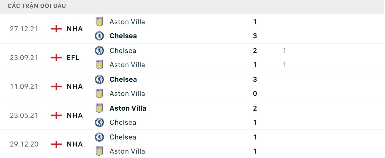 Thành tích đối đầu Aston Villa vs Chelsea: