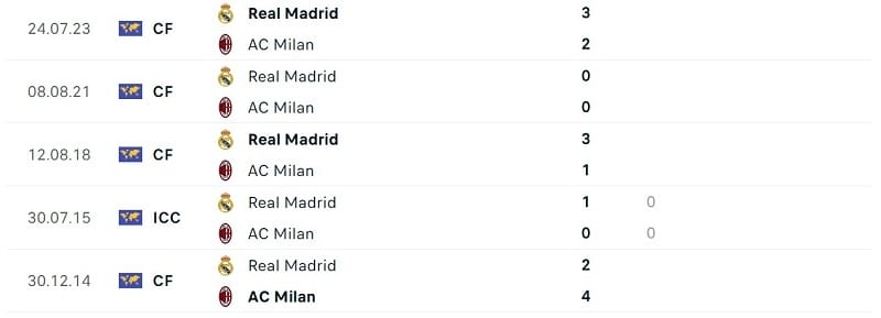 Lịch sử đối đầu hiện đang nghiêng về phía Real Madrid. Trong 5 lần chạm trán gần nhất, Los Blancos có 2 chiến thắng và 2 trận hòa. Còn lại, AC Milan có 1 lần đánh bại được đội chủ sân Santiago Bernabeu.