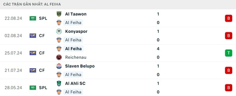 5 trận gần nhất, Al Feiha thắng 1 và thua tận 4. Thành tích sân nhà của Al Fayha mùa giải trước rất đáng nể, với 4 trận thắng, 7 trận hòa và 6 trận thua. Họ hy vọng sẽ kéo dài chuỗi 4 trận bất bại trên sân nhà và gây bất ngờ trước Al Nassr.