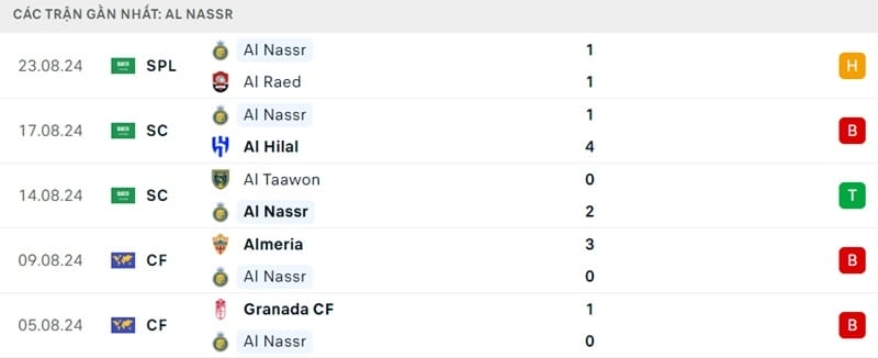 5 trận ra sân gần nhất, Al Nassr chỉ thắng 1, hòa 1 và nhận 3 thất bại.