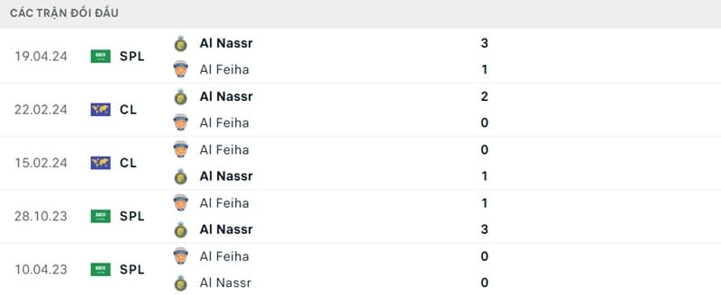 Kết quả đối đầu các trận gần đây nhất của Al Feiha vs Al Nassr