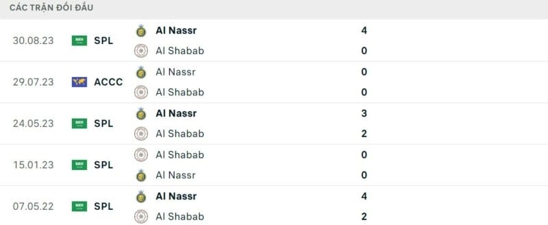 Thành tích đối đầu Al Shabab vs Al Nassr