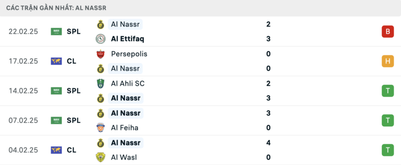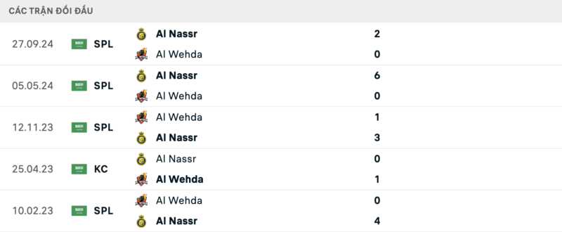 Thành tích đối đầu nghiêng về phía Al Nassr. Họ đã thắng 5 trong 6 lần gần nhất chạm trán Al Wehda.