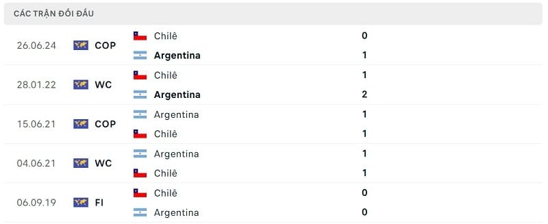 Kết quả đối đầu các trận gần đây nhất của Argentina vs Chile