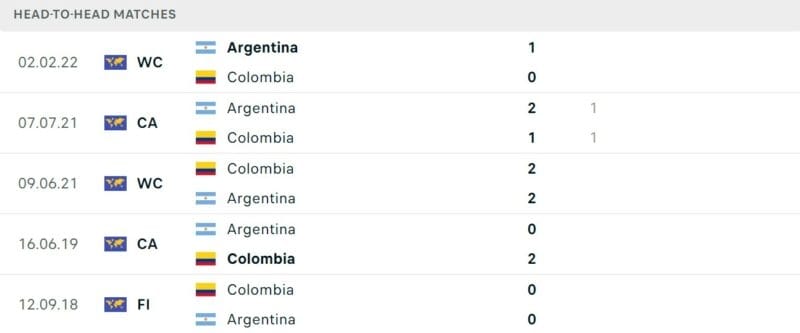 Kết quả các trận đối đầu gần đây nhất giữa Argentina vs Colombia