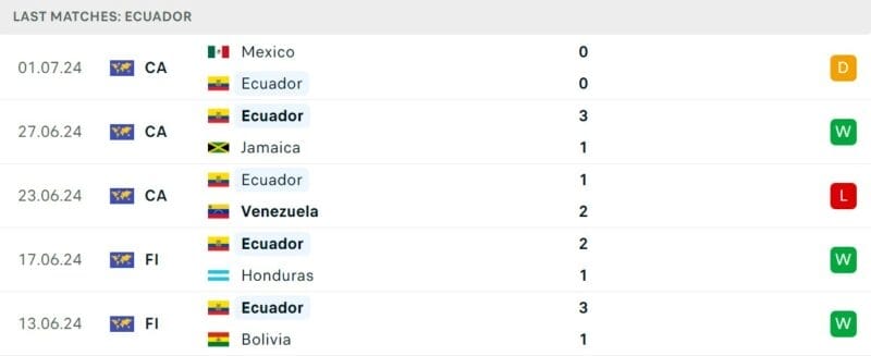 Ecuador chạy đà khá tốt trước thềm Copa America 2024 với 2 chiến thắng liên tiếp trong các trận giao hữu. Nhưng khi bước vào giải, họ chưa thể hiện một bộ mặt thuyết phục khi chỉ thắng 1 trong 3 trận vòng bảng.