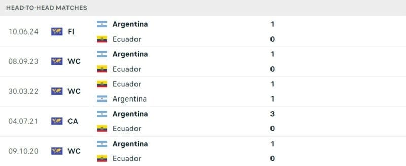 Kết quả đối đầu các trận gần đây nhất của Argentina vs Ecuador