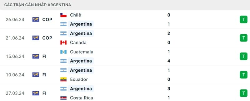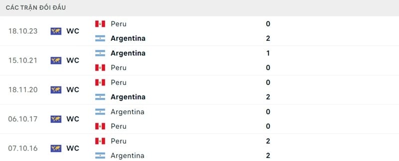 Kết quả đối đầu các trận gần đây nhất của Argentina vs Peru