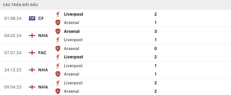 Kết quả đối đầu các trận gần đây nhất của Arsenal vs Liverpool