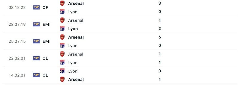 Kết quả đối đầu các trận gần đây nhất của Arsenal vs Lyon