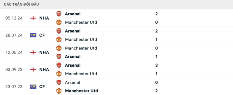 Kết quả đối đầu các trận gần đây nhất của Arsenal vs Man United
