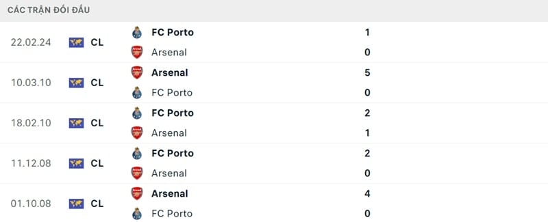 Thành tích đối đầu Arsenal vs Porto: