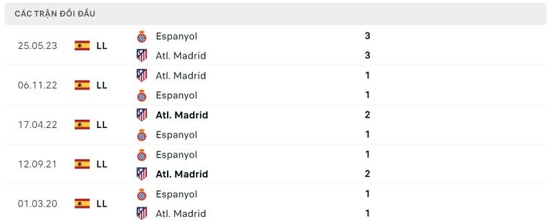 Kết quả đối đầu các trận gần đây nhất của Atletico Madrid vs Espanyol