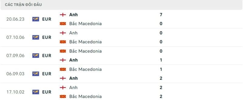 Thành tích đối đầu Bắc Macedonia vs Anh:
